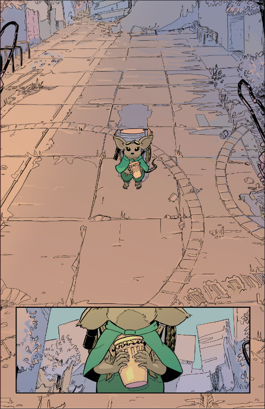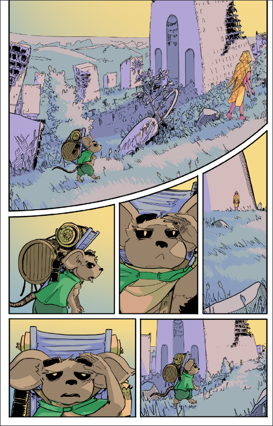 A mousy pilgrim trudges through an overgrown square. Tiny attendants skitter underfoot, ferrying hunks of oldstone and what whatever other scrap their little tools could salvage. Vines crawl up the structures around her, an entire ecosystem built on what was left behind by those that came before, if you believe the ringwalkers.